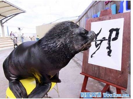海狮挥毫泼墨 写汉字"卯"喜迎新年
