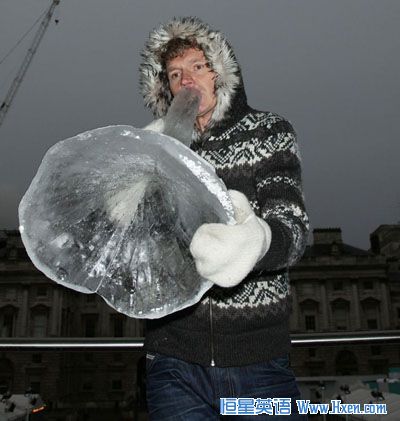照片显示的是挪威演奏家泰勒杰 艾伊桑格赛特1月6日在英国伦敦演奏用冰做成的号角。这个冰号角用具有600年历史的约斯达布连冰川制作而成。