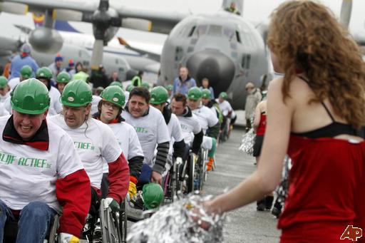 Wheelchair users attempt to pull an aircraft. According to AP, 70 disabled participants tried their best to pull a 67-ton military C-130 cargo plane for a distance of 100 yards (91.44 meters) in Brussels, Saturday, in the hopes of setting a world record.