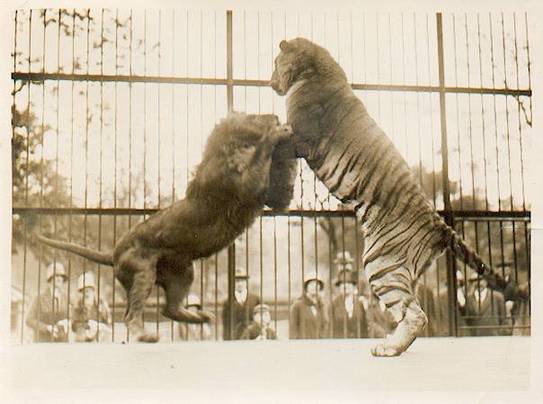 这只老虎将前爪伸过笼子的铁栅栏,抓破了狮子的颈静脉,而后狮子一命呜呼,倒在了血泊之中。