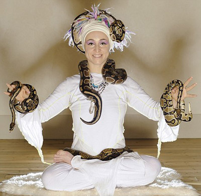 It was devised by self-confessed ‘mad snake lady’ Kwali Kumara, who sits at the front of the class today dressed in flowing white robes and a spiky Medusa-inspired piece of headgear. The aim of the class is, according to Kwali, to ‘deepen our connection to the spirit and natural world,’ using her ‘friendly, healing snakes’ as our guides. Overcoming your natural aversion to the snakes will help ‘unblock your chakras’, allowing energy to flow freely throughout the body — which can apparently improve every area of your life. Well, so the story goes, anyway.