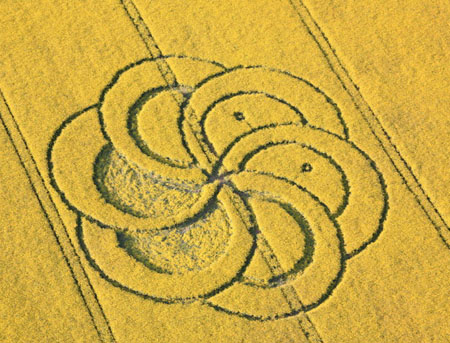 2011年5月3日,在英国威尔特郡的西尔布利山下,麦田怪圈研究人员Lucy Pringle在一片金黄的油菜籽地中拍摄到一个直径达30.48米的怪圈。据了解,该怪圈图案像一朵花,由六个貌似新月的“花瓣”连接而成。