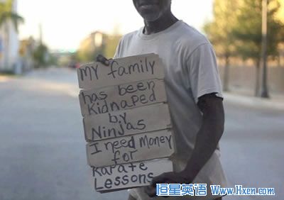 'My family has been kidnapped by ninjas. I need money for karate lessons,' it reads.