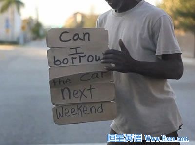 纸牌上写的字旨在唤起路人的同情心,给他一点零钱。