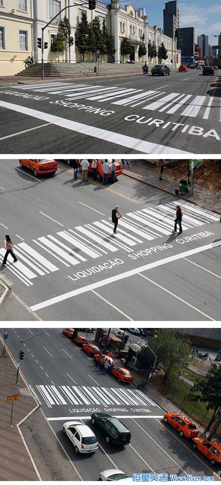 Creative zebra crossing that looks like a bar code was used to promote a sale at Curitiba shopping center in Brazil.有创意的斑马线看起来像巴西库里蒂巴购物中心用于促进的销售的条形码。 2/10 首页 上一页 1 2 3 4 5 6 下一页 尾页