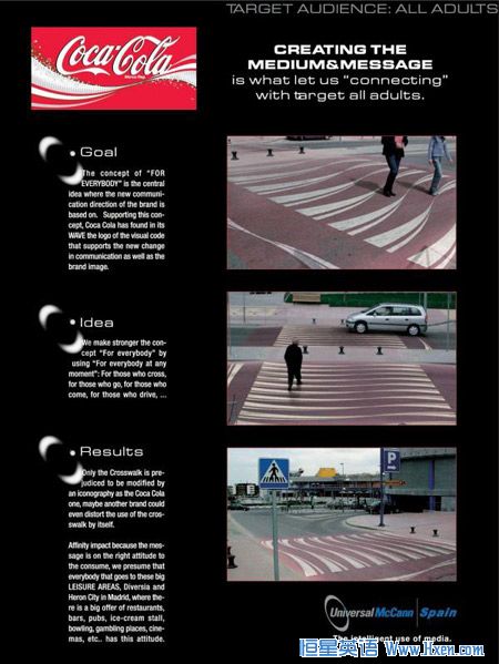 名为可口可乐人行横道的平面广告是由优势麦肯广告公司为西班牙可口可乐公司制作的。它于2002年9月发布。