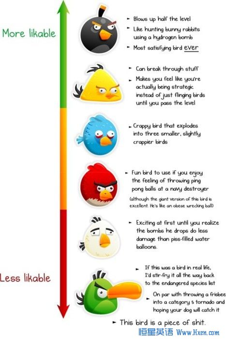 愤怒的小鸟中你最喜欢哪只鸟?来,我们来看下这六只鸟儿的战斗力排行榜吧: