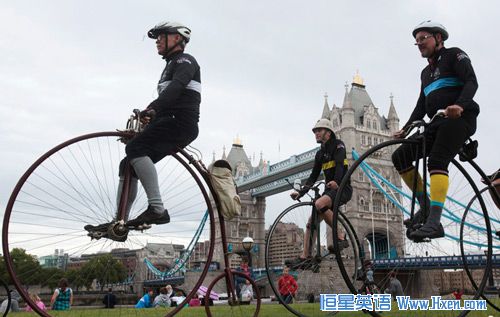 2011年6月9日,英国伦敦,马戏单车骑手在塔桥旁展示技艺(见上图)。这些骑手将于6月11号参加在伦敦举行的伦敦诺科特妮自行车大赛,选手围绕历史悠久的史密斯菲尔德市场骑行30分钟另加5圈,优胜者将获得布鲁克斯-奥迪纳瑞奖杯。