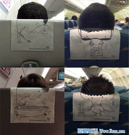 NH酒店广告位于伊比利亚航空公司的头枕上。在头枕的背后,你可以看到享受NH酒店提供的不同活动的插图:高尔夫,日光浴,桑拿浴等。旅客们坐下来的时候,可以看到他们眼前的插图,而且插图的顶部,你可以看到前面坐着那个人的头发,就像插图上的头发一样。