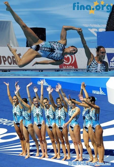 The Spanish synchronized swimming team in awesome skeleton swimsuits in Rome 2009. 西班牙游泳队在2009年罗马运动会上都穿着很棒的骨骼泳衣。