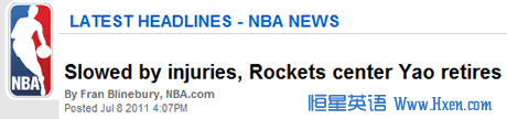 姚明是第一个闯入NBA成为主力的中国篮球球星,据NBA联盟消息称,在休斯顿火箭队度过了九个霉运缠身的赛季后,姚明已经决定退役。
