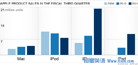 在苹果这个强劲的销售季Ipod成为了它的弱点,因为这一季Ipod只卖出了750万台,比去年同期下降了20%。在上一个季度苹果的平板电脑第一次销量超过了Ipod。
