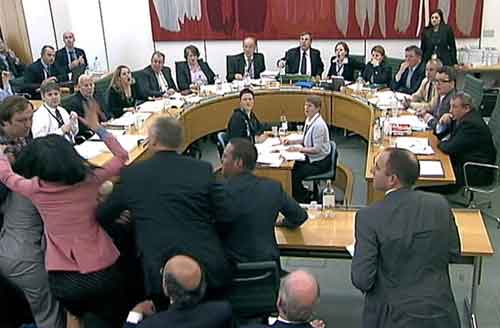 听证会持续三个小时,气氛严肃,但也有时紧张。接近尾声时,立法人员要求默多克解释收买相关人员的行为,窃听事实已暗藏十年之久。此时一名男子在拥挤的委员会大厅的听证席起身袭击默多克,上演了一场充满暴力的闹剧。