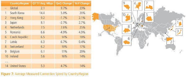 Akamai每年都会发布有关于英特网的年度报告,这个报告不出意料的话应该会有很高的涵盖面,报道包括宽带和窄带在全球的发展趋势。想知道什么大新闻吗?全球的连接速度从去年以来上升了23%达到了2.1兆每秒。而速度评级一直处在优秀的美国带宽上升了15%达到了5.3兆每秒,但是美国还是只能排到全球的第14位。正如所预期的,亚洲国家主宰了这一场带宽比赛,其中日本有61个城市进入了全球宽带速度最快的前100个城市。当然,如果你目标高远想要成为最快的地区,那么你至少需要比San Jose或者加州的Riverside以及爱尔兰的Wu快,因为他们的平均速度都达到了7.8兆每秒。
