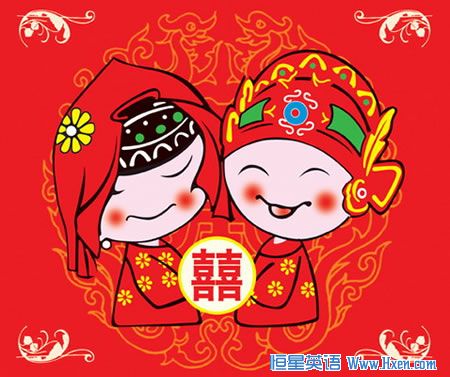 The Chinese regard the color red as the symbol of happiness, success, luck, faith and growth. They like red very much, which comes from worship of the Sun. In traditional Chinese weddings, there are double Xi characters in red, red scarves, red flowers and the bride wears a red coat. 中国人将红色看做是幸福、成功、好运、忠诚和繁荣的象征。他们很喜欢红色,其实是由于对太阳的崇拜。在传统中国婚礼上,有红色的“囍”字、红色的丝带、红花和新娘的红衣。