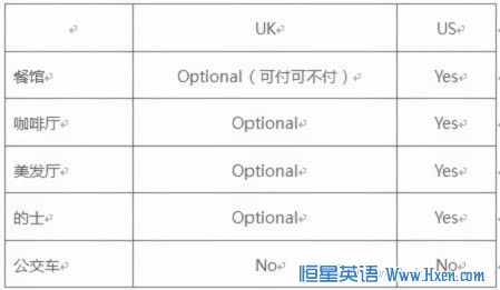 US:通常小费是账单的一部分,而且非付不可!尤其是在餐厅,如果不给小费,就被认为是没有付完账单,所以要小心了。