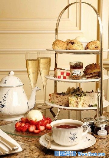 下午茶(因为它通常是在傍晚时享用),又称"low tea",这样叫是因为它是放在一张矮桌上享用的。由于这不是一顿饭,而更像是一顿傍晚时分为避免饥饿而食用的小吃,因此摆放的食物通常都是可以用手拿着吃的。美味的小块三明治、烤饼和酥皮糕点通常都是享用下午茶时的小吃。这些便于手拿的食物可以让人们一边小口品尝一边还能轻松地进行交谈——这是最为重要的一点——因为人们不只是为了补充营养或充饥而喝茶,而是要借此机会放松自己,聊聊天和享受好友陪伴的乐趣。在英国,传统的喝茶时间是在下午四五点钟,而且下午茶都会在七点以前结束。