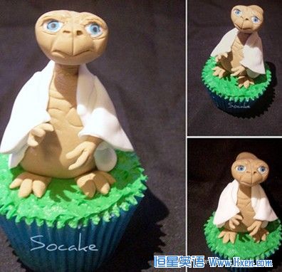 ET Cupcake 外星人纸杯蛋糕The alien is hand molded out of fondant and is completely edible. 这个外星人是用方旦糖手工制成的,完全可以食用。
