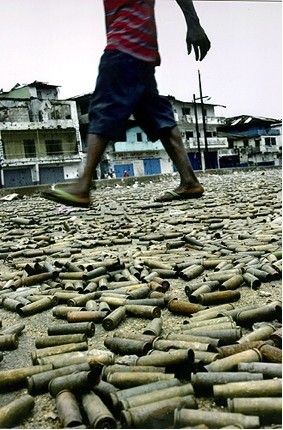Bullet casings cover entirely a street in Monrovia. The Liberian capital was the worst affected region, because it was the scene of heavy fighting between government soldiers and rebel forces。