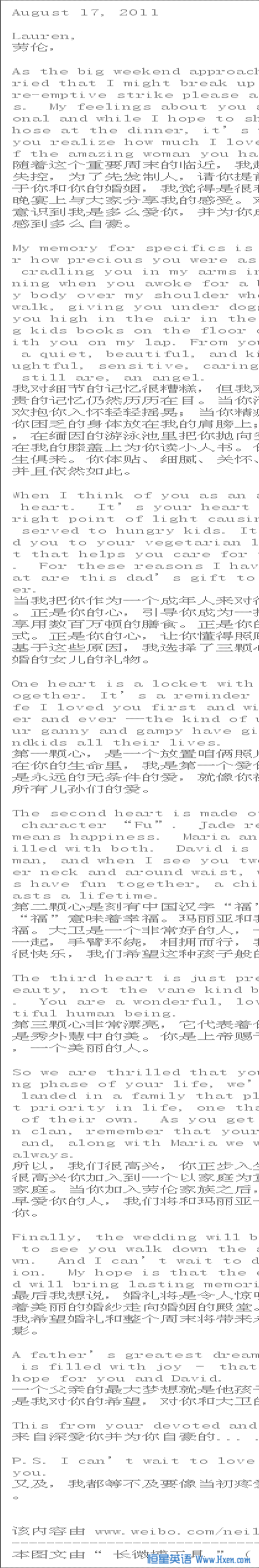 布什哥哥给出嫁女儿的信:我是第一个爱你的男人