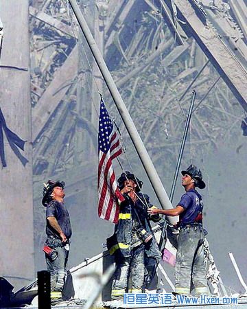 消防员在世贸中心双子塔的废墟上树起旗帜。