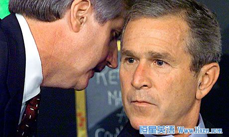 8:50 a.m.: White House Chief of Staff Andrew Card tells President George W. Bush, who's visiting a Florida elementary school, about the crash. 白宫幕僚长Andrew Card向布什总统汇报了袭击事件,此时布什正在访问佛罗里达的一所小学。