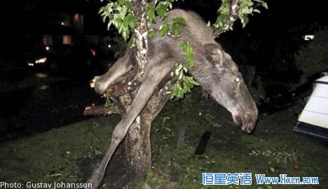 在瑞典西部一只醉了的麋鹿为了再吃一口已经发酵了的苹果,“不幸”失去了平衡,卡在了苹果树间。