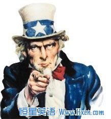 "Uncle Sam"是美国人的绰号。它源自1812-1814年间美英战争时期的一个历史传说。相传在纽约州的特洛伊城(Troy)有位年长的肉类加工商,名叫山缪尔•威尔逊(Samuel Wilson)。他勤劳、诚实、能干,很有威信,人们亲切地叫他"山姆大叔(Uncle Sam)"(注:Sam为Samuel的昵称)。这位山姆大叔也是一位爱国者,他与父兄曾参加过美国独立战争。在1812年的美英战争中,他的工厂与政府签了一份为军队生产桶装牛肉的合同,美国政府每当收到他交来的经其亲自检验合格的牛肉,就将肉装入特制的木桶,并在桶上盖上US的记号。由于Uncle Sam的首字母是US,而美国(The United States)的缩写也是U.S.,于是人们便把这两个名称合二为一了,意即那些经"山姆大叔"之手的牛肉,成了"美国"的财产。于是当地的人们就把"山姆大叔"当成美国的绰号,并逐渐流传开来。