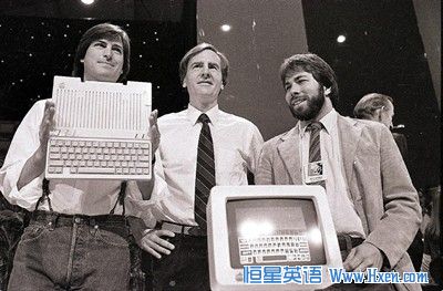 照片左起分别是苹果董事长史蒂夫乔布斯,总裁兼CEO约翰斯卡利,创始人之一的斯蒂夫沃兹尼亚克,他们正在推出新款苹果II c型机,1984年4月24日,旧金山