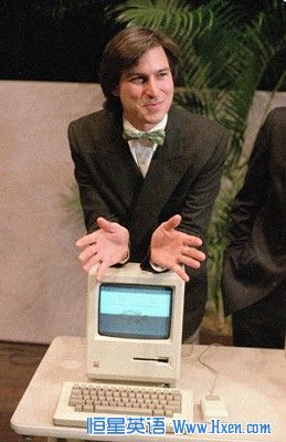 乔布斯靠在一台“麦金托什”个人电脑上在股东大会谈笑风生,1984年1月,旧金山,库比蒂诺
