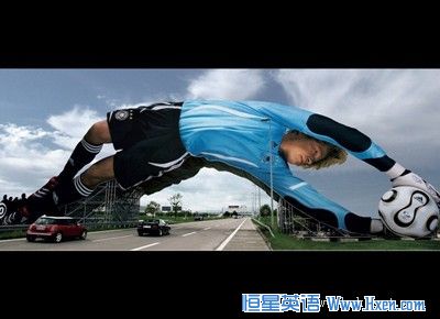 如果你在2006年到慕尼黑来参加FIFA世界杯的首场比赛,那么你很有可能看见这个巨型装置,这个装置展示了213英尺长的庞大的奥利弗·卡恩(德国国家队的守门员)横跨高速公路。这是阿迪达斯在当年的全称比赛中在德国做的唯一一个广告。这个是由柏林TBWA广告公司代理的。
