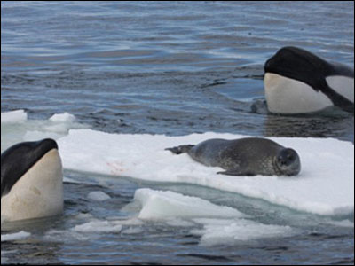 The seal feels perfectly safe lying on the Antarctic ice even if it is surrounded by a pod of killer whales.