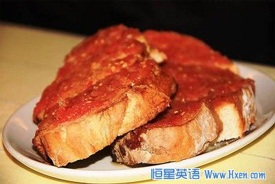 5. 西班牙早餐——Pan a la Catalana或者是Pan con Tomate(一种面包),西班牙的早餐一般很简单,但是却很美味。就是把新鲜的大蒜和成熟的番茄酱擦在面包上,然后加少许橄榄油和盐。为了满足更多的需求,也可以在面包的最上面放上些奶酪,火腿或者香肠。