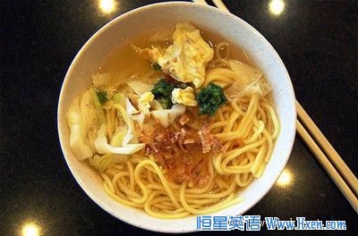 35. Malaysian breakfast——A hot bowl of Mee–noodles mixed with egg, vegetable and tasty spices.