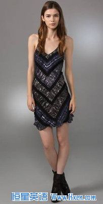 这款Dallin Chase的小礼服在“V”形条纹上加上了金属色亮片和一些褶皱装饰。