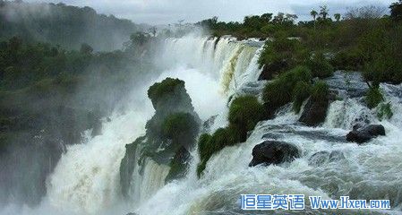 伊瓜苏瀑布群2.7公里的范围内最大落差为82米。瀑布跨越巴西、阿根廷和巴拉圭。如恶魔的喉咙般的80米的瀑布跨坐在阿根廷和巴西的边界上。珊瑚树、蝴蝶、犀鸟和蜂鸟是这个地区特有的动植物。