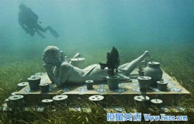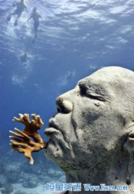 在墨西哥的度假胜地坎昆,潜水爱好者们正游经英国艺术家Jason de Caires Taylor'的雕像“The Man on Fire”。在墨西哥度假胜地坎昆的海底,人们把许多座雕像浸在海底,建造了一座海底博物馆,这些雕像与美丽的珊瑚两相呼应,更与蓝绿色海水和太阳照耀的光斑相得益彰。