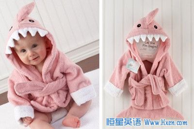 一个新生宝宝穿着粉色的毛绒浴衣,看上去就像只小鲨鱼,多好的点子!你知道吗,鲨鱼是强壮健康的生物,没有动物能比它活得更好了。
