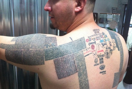 Pat Vaillancourt is the current record holder for the most web addresses tattooed on his body, with over 10,000 URL’s inked on his back and shoulders. That sounds like a lot, but he’s not stopping until his body is covered by 100,000 website addresses. 帕特·瓦扬古目前保持着这样一个古怪的记录:他身上纹着世界上最多的网站地址,在他的背上和肩膀上一共有1万个网站链接。1万个,听起来是不是觉得很多?不过他的终极目标可不止这些:他要在身上纹上10万个网站地址。