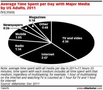 The average adult consumer has spent 4 hours and 34 minutes each day watching TV and video on a traditional television set this year, up 10 minutes from last year, eMarketer estimates. 根据eMarketer估计,在今年,成人消费者平均每天会花4小时34分钟,坐在传统的电视机面前观看电视和视频,这比去年的数据增加了10分钟。
