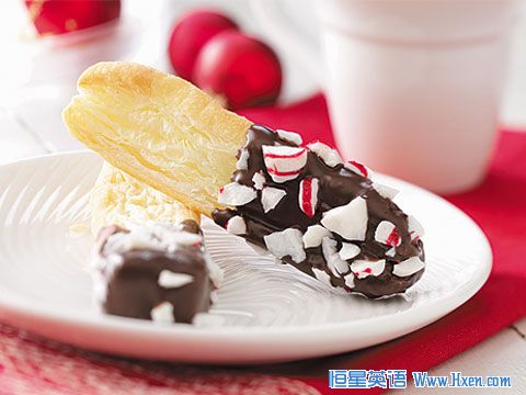 这些巧克力包着的饼干勾起你在欧式面包中找到的甜蜜(薄荷松饼棒只需三种材料:现成的冷冻酥皮,牛奶巧克力糖果涂料和压碎的薄荷糖,制作也很简单)。