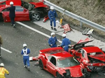 发生了什么?一批超级跑车行驶在日本的高速公路上。有一辆法拉利在超车时失去控制,因而造成连环撞车,这是史无前例的。