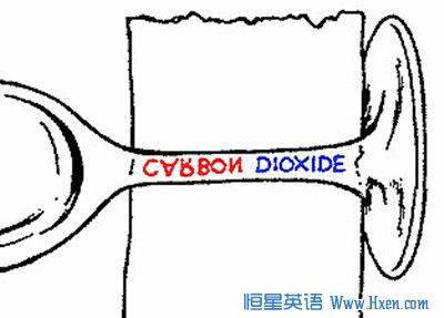 说明:首先要解释一番,就如白光通过三棱镜会分离出不同颜色一样,带颜色的光透过玻璃也会这样。接着在一张白纸上写上“CARBON DIOXIDE”“CARBON”用红色写,“DIOXIDE”用蓝色写。透过高脚杯的杯子干看这两个单词,会发现“CARBON”倒过来了,而“DIOXIDE”却没有,所以,红色的光更容易受到玻璃的影响,对吗?