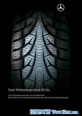 “圣诞大酬宾:如果您买整套的雪地轮胎,您将会得到75欧元奖金”。这幅广告海报名为“圣诞树”,由德国奔驰汽车提供,于2007年12月投入市场。