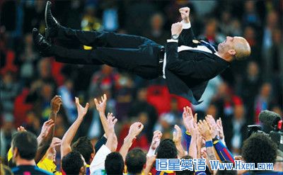 Barcelona's Spanish coach, Josep Guardiola,is thrown in the air after his team beat Manchester United to win the Champions League final on May 28. Barcelona won 3-1. Luis Gene / Agence France-Presse