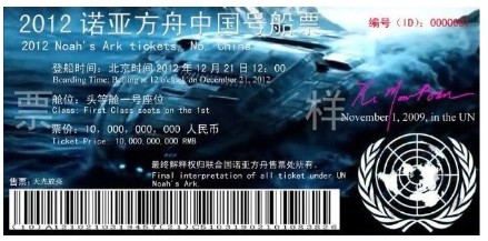 Although there are several versions of the ticket, the information on all of them remains consistent – the boarding time, which is midnight on December 21st 2012, and the boarding place, at Zhuo Ming Gu dock. This is the same information that is talked about in the movie 2012. Cabin seats and ticket numbers have also been included. To make the tickets look real, some stores have introduced ticketing systems that allow the customers to enter their name, nationality and other information on their tickets.