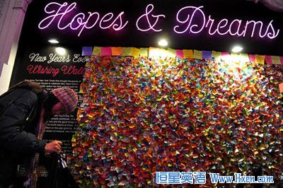 A woman writes her wish on a piece of confetti in front of the New Year's Eve Wishing Wall at Times Square Information Center in New York, the United States, Dec 29, 2011.