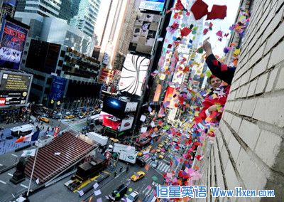 Staff members toss confetti from a window during the annual "air worthiness test" of New Year's Eve confetti at Times Square, in New York, the United States, Dec 29, 2011.