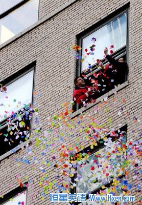 工作人员正在纽约时代广场将写满祝福的五色彩纸洒向人群。