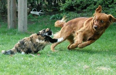 这是最搞笑得一张图片了!这只狗是真的被这只猫吓着了!看他的表情!